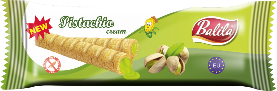 kasza kukurydziana 17 %, cukier, oleje roślinne (kokosowy, słonecznikowy), odtłuszczone MLEKO w proszku, SERWATKA (z MLEKA) w proszku, emulgator: lecytyny (ze słonecznika), aromaty (PISTACJI, wanilina), barwnik: kurkumina, sól.